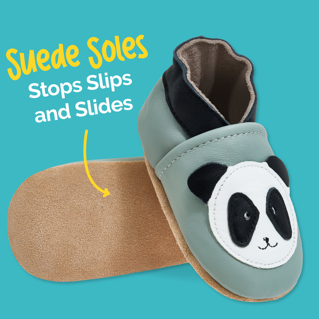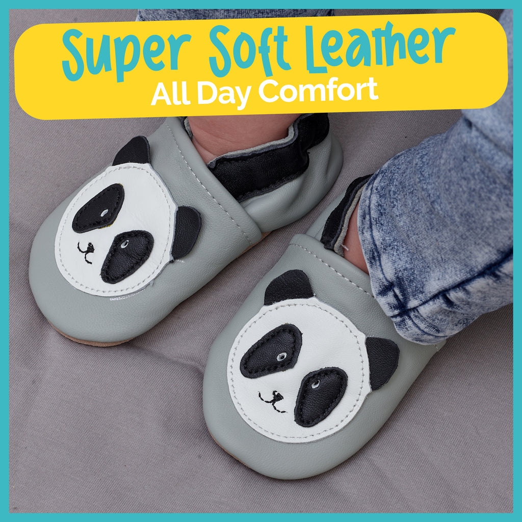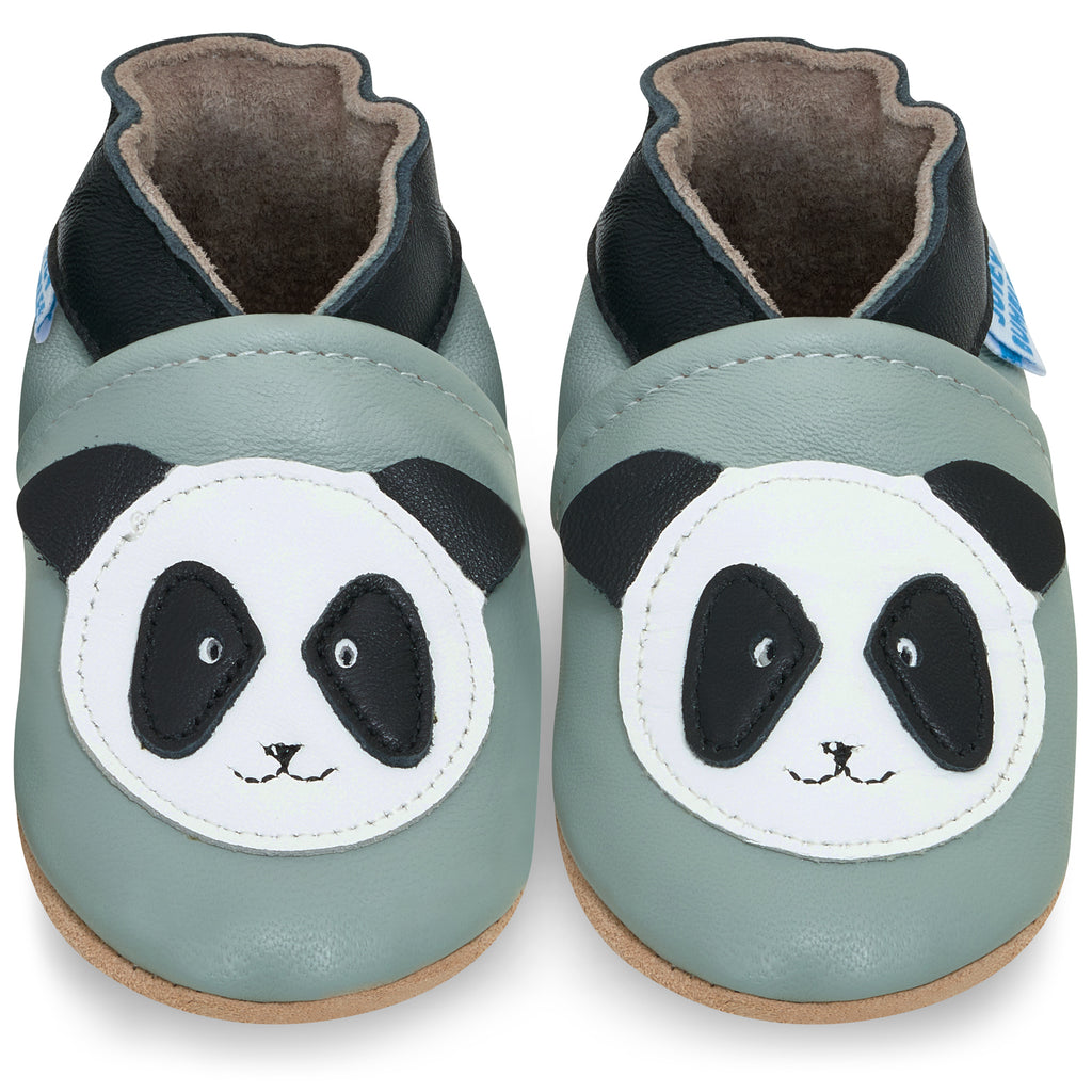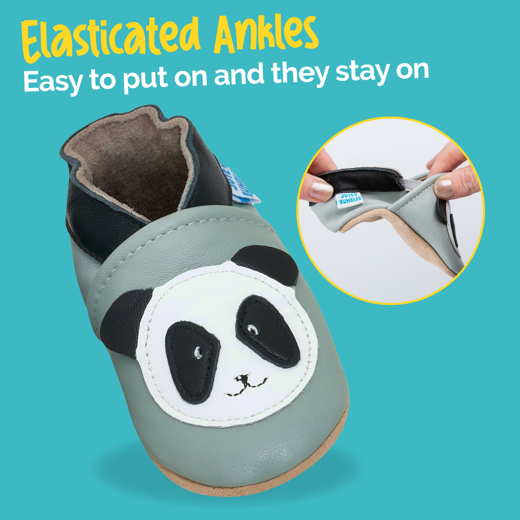 Our panda baby shoes feature a happy panda with a curious face on a grey background. The shoes are finished with black trim around the elasticated ankles. Perfect for baby boys and girls.